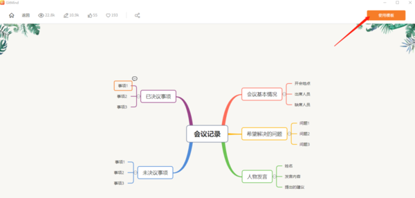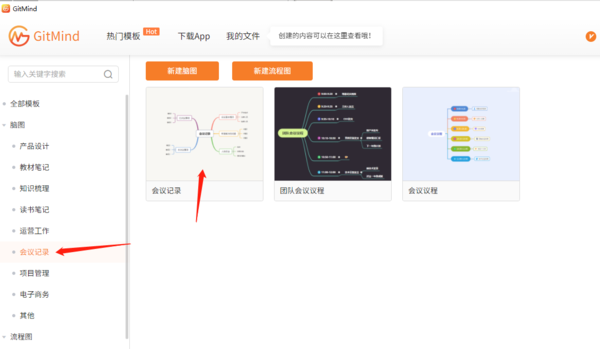首先,我们打开Gitmind,进入之后即可来到Gitmind模板界面,接着我们在左侧模板分类栏中选择【会议记录】。接着,我们即可在右侧看到对应3个Gitmind会议纪要模板,对此我们可以选择1款自己喜欢的会议纪要模板去进行再创作。