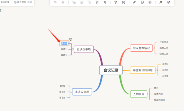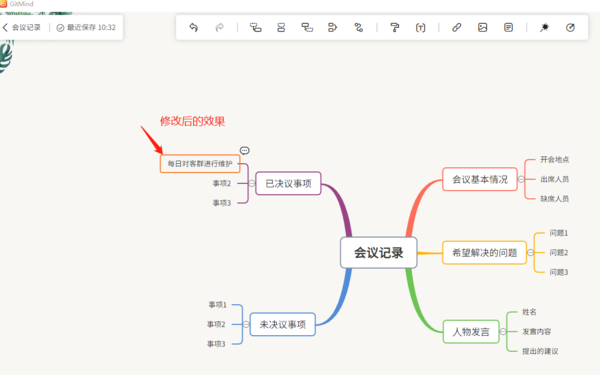 这里我们随意选择1款模板,进入后展示Gitmind会议纪要再创作过程。我们可以看到,这个模板中,只是对二级节点进行了明确的定义,而三级节点则还需我们进行具体化的扩充,如果我们想修改三级标节点的话,只需双击点击对应三级节点,此时会展现出文本框,接着我们就可以将三级节点中的文字改成我们想要的内容了。同样地,如果我们想修改二级节点中的内容,可以通过同样方法操作进行更改。