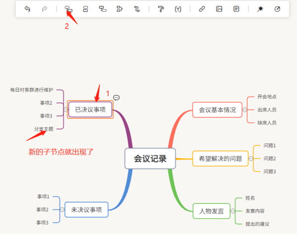 另外,如果我们要新增一些子节点,就点击对应节点,再点上方的【添加子节点】,即可轻松实现Gitmind会议纪要中子节点的添加。