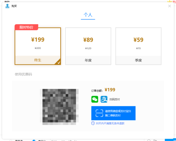 在这里有三个档位的会员开通选项,分别是季度、年度以及终生会员,分别是季度会员59元,年度会员89元以及终生会员199元。选择需要开通的会员,之后使用微信或者支付宝扫描下面的二维码,付款后会员就开通成功了。