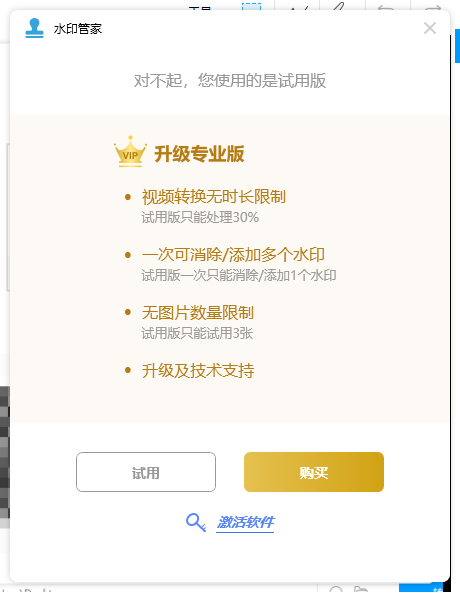 1、首先未开通会员时的试用版软件只能处理3个文件,会限制水印处理的数量。