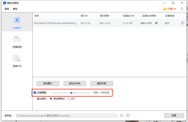 接着在下方可以调整压缩的强度,如果需要更换成JPG格式,也可以在下面选择“JPG”格式选项,默认的是保存为原格式。