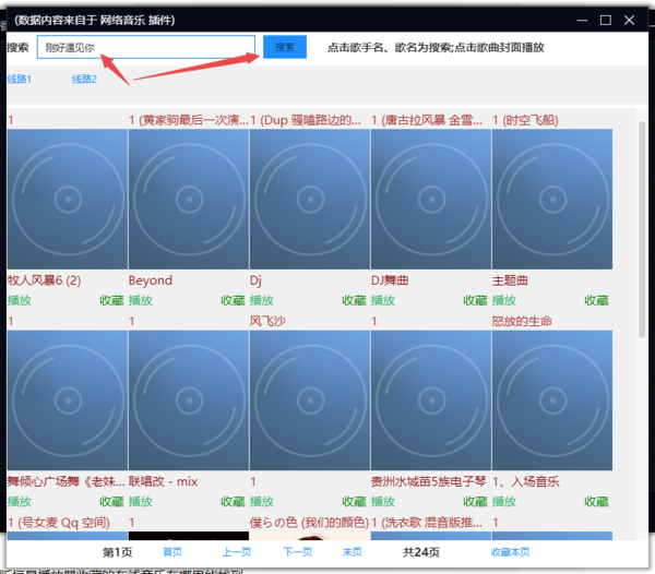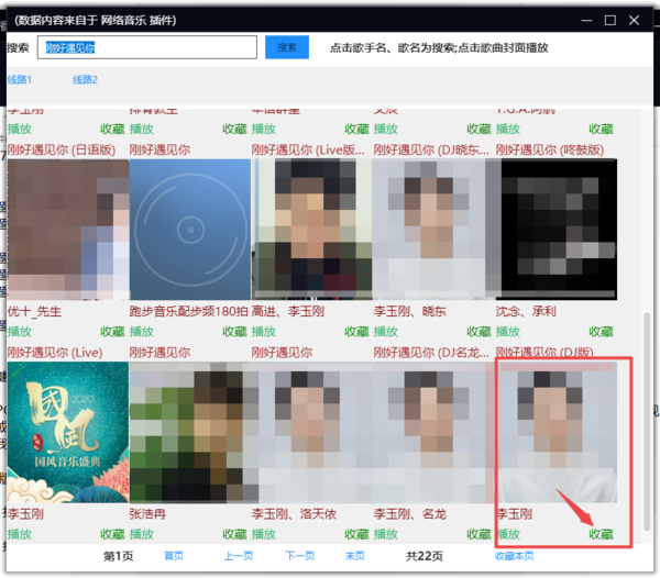 3、然后我们在搜索处理的列表中,找到歌曲,然后在歌曲封面的右下角会有一个【收藏】按钮,点击它就可以进行歌曲的收藏了,而点击【播放】按钮或者是歌曲的封面,就可以进行歌曲的播放了。