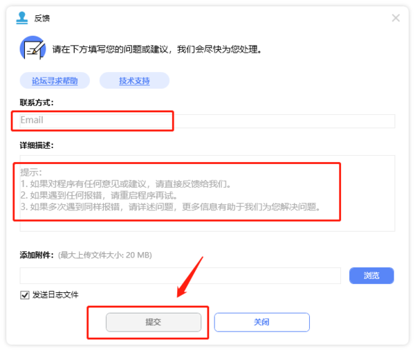 这时会跳转到反馈详情界面,在这里输入联系邮箱、所遇到的问题以及截图相关的辅助附件,最后点击下面的“提交”就可以将问题反馈到官方了。