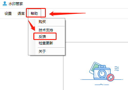 首先打开水印管家,接着在最上方的三个选项中选择“帮助”,接着在出现的下拉菜单中,点击“反馈”选项。
