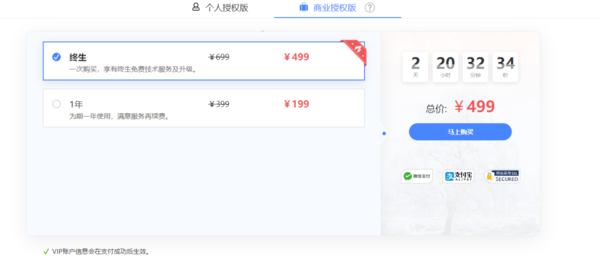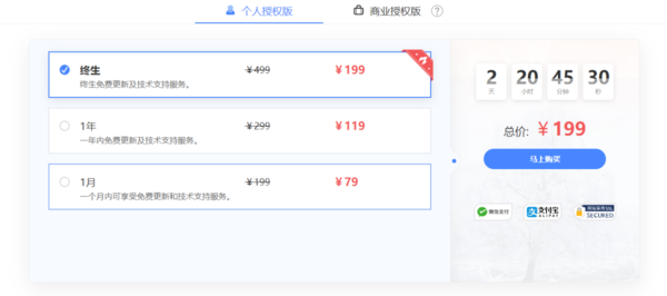 而商业版本有两种时长可以选择,一年使用时长的199元,终身使用权需要499元。