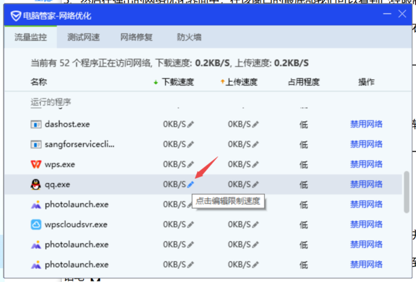 2、接着在弹出的网络优化窗口中,找到想要限制网络速度的软件,然后找到想要设置的【下载速度】或【上传速度】右侧的铅笔的【点击编辑限制速度】的图标。