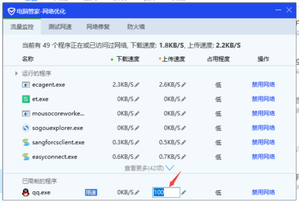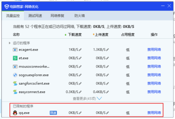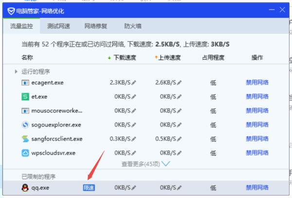 4、最后我们就可以在腾讯电脑管家的网络优化窗口的底部,看到刚刚设置好的限制网络速度的应用程序了。