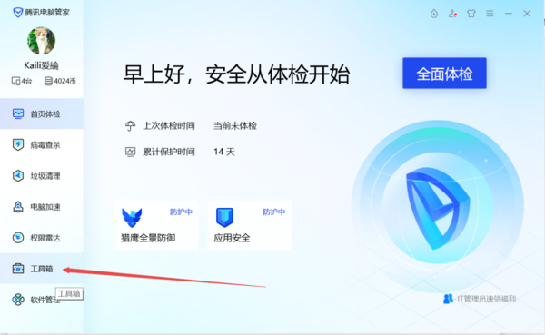 1、启动电脑上的腾讯电脑管家,然后找到界面左侧列表上的【工具箱】选项,并点击它。