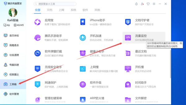 1、我们还是打开腾讯电脑管家软件的【工具箱】中的【流量监控】工具,并点击进入。