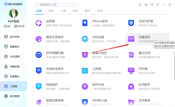 2、接着在工具箱界面中找到界面右侧的【流量监控】选项,并点击它。