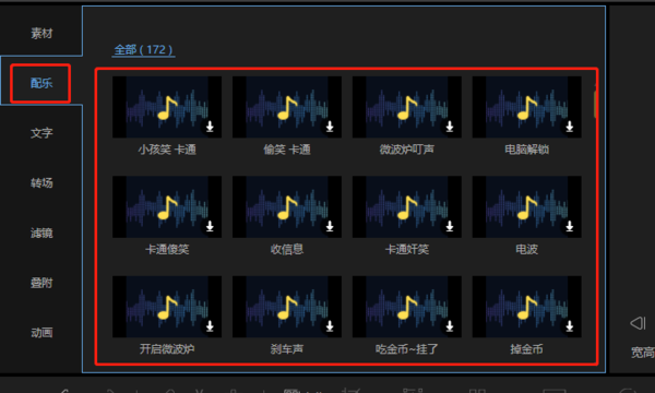 还有一方法,是直接使用软件中自带素材库中的配乐,在左上方“配乐”一项中找到合适的音乐,点击下载后就可以添加到视频中来了,在“音频”轨道中可以随意移动调换位置。