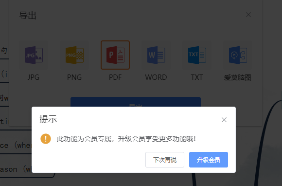 爱莫脑图的导出功能需要开通会员功能,所以无法导出也是由于账号还是非会员的状态,这时候只需要开通会员就可以正常的将思维导图以需要的格式来导出到本地了。