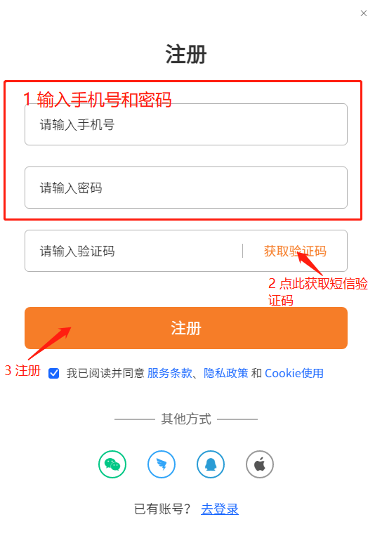 1、账密登录。刚刚我们在注册账号的时候,输入了手机号和密码,之后我们在登录账号就会用到,在账号密码栏对应地输入账号密码即可登录Gitmind。