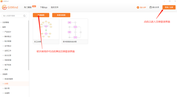 在我们打开Gitmind后,点击其右上角的【登录/注册】即可来到Gitmind的账号等注册界面。(如果是初次使用Gitmind,也可以点击【新建脑图】以弹出账号登录注册界面)。