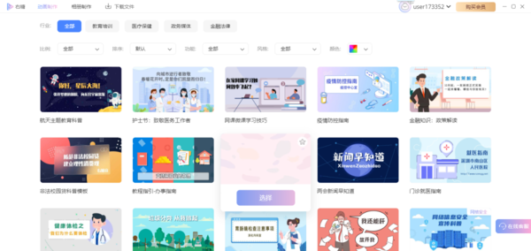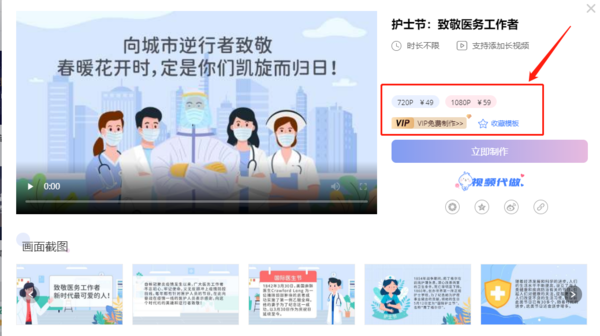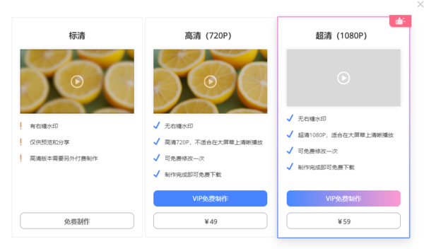 右糖软件中的视频模板种类很丰富,所以可以在这里选择不同类型的模板来直接使用,但是点开任意一个模板时,都会在右侧看到720p和1080p两种画质的视频模板是需要收费的,标清版本是不收费的,但标清版本的视频只支持预览或是分享,是不能下载保存的。
