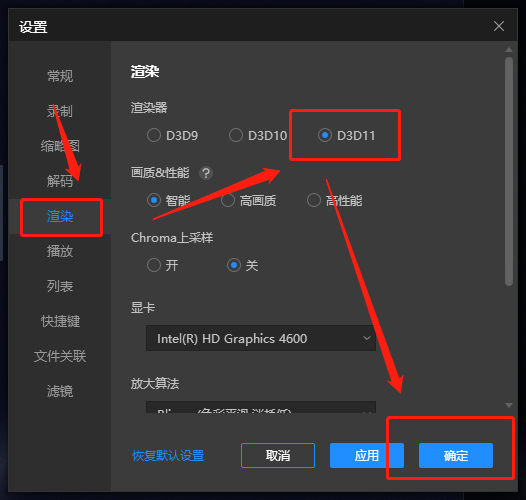 再者可以尝试下升级显卡驱动,如果还是没有办法解决这个问题,还可以在播放器中右键打开“设置”,在“渲染”模块中将渲染器更改设置为“D3D11”,最后点击“确定”就可以使用了。