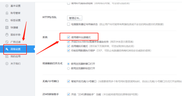 进入到设置界面后,在左侧点击“高级设置”,然后向下拉页面,找到“使用硬件加速模式”一项并勾选,重启浏览器后功能就会生效了,开启硬件加速后上网速度也会相应的变快很多。