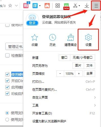 还可以开启浏览器的硬件加速,首先点击浏览器右上角的“菜单”,然后在选项列表中点击“设置”。