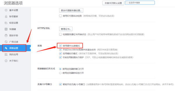 在设置界面的左侧导航栏中找到“高级设置”,然后将右侧页面向下拉,找到“系统”一行后,勾选中第一个“使用硬件加速模式”选项,然后重启浏览器,硬件加速功能就生效了。