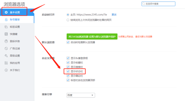2、仍然是在设置界面中,在左侧第一项“基本设置”的“自定义界面”中,勾选上“显示状态栏”,不需要重启浏览器,状态栏就会出现在浏览器的左下角了。