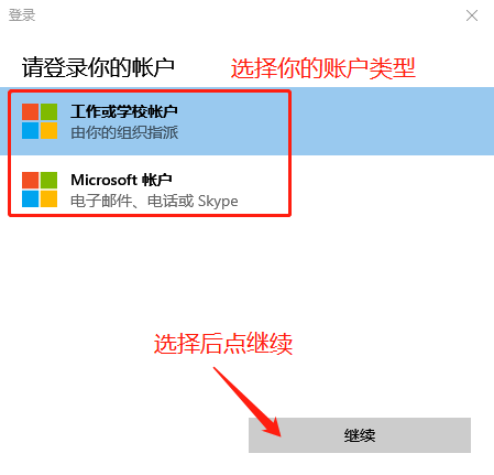 2、接着,需要我们选择自己的微软账号类型,在选择后点击【继续】,以来到微软账号输入界面。