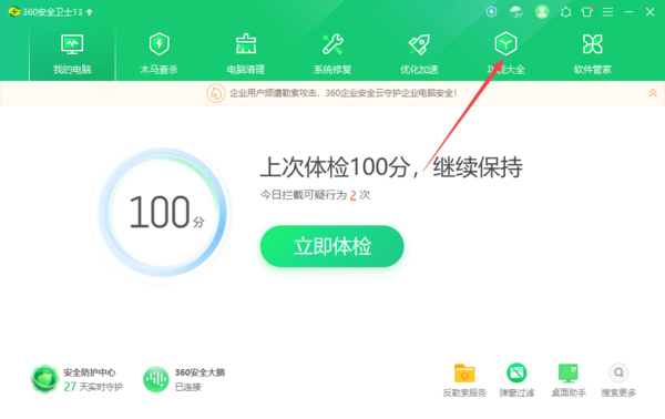 1、打开电脑上的360安全卫士,然后点击界面上方的【功能大全】选项。