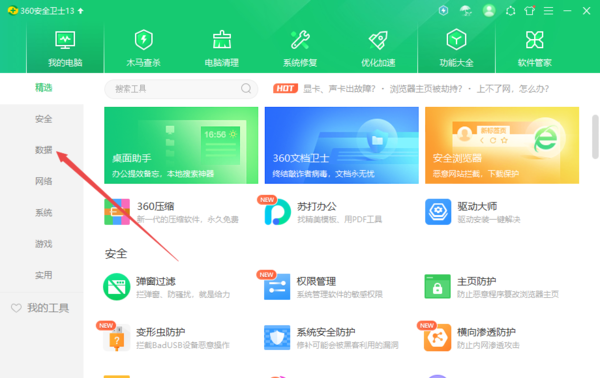2、进入到360安全卫士的功能大全界面当中后,点击界面左侧的【数据】选项。