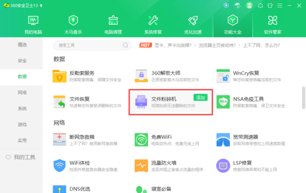 3、进入到数据选项当中后,在右侧的界面中找到【文件粉碎机】功能,并点击进行添加。
