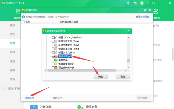 4、文件粉碎机功能添加成功后,电脑上就会弹出文件粉碎机的窗口,点击界面左下角的【添加文件】按钮,然后将需要进行粉碎的文件进行选中,然后点击【确定】按钮。