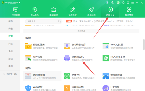 360安全卫士的文件粉碎机的位置就在功能大全的各种工具当中,找到它也是非常的方便的。