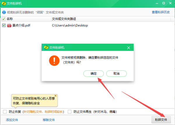 5、想要粉碎的文件选中好以后,点击文件粉碎机窗口右下角的【粉碎文件】按钮。此时系统会弹出【文件将彻底删除,确定要粉碎选定的文件(文件夹)吗?】,点击【确定】按钮即可将文件进行粉碎删除了。