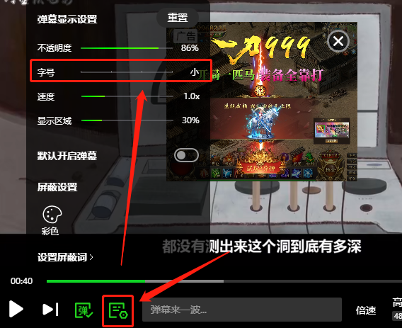 打开视频播放的界面后,在进度条的下方有一个带有齿轮样式的图标,点击后上方会出现相关的选项,在这里我们将“字号”一项向左拖动,这时候弹幕的字体就会变小了。反之,如果想让弹幕的字体变大一些,就向右拖拽即可将字体变大。