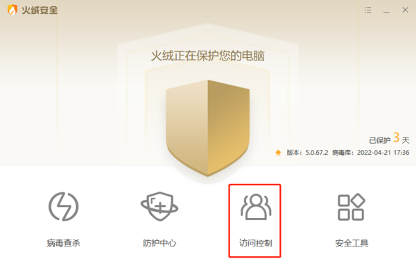 当我们打开火绒安全软件,来到主界面后,即可看到四大主功能,其中第三项就是【访问控制】,点击即可进入。
