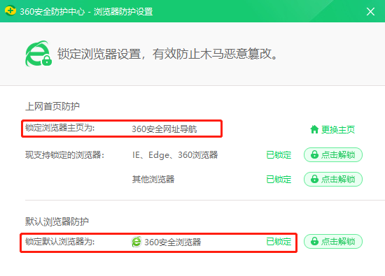在出现的弹窗中点击“更换主页”将主页更换为自己需要的主页页面,并把下方的默认浏览器锁定为360浏览器。