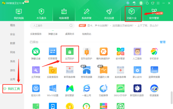 这时候我们可以借助360安全卫士来对主页篡改问题进行防护,这里我们打开360安全卫士,在上方的几个选项中选择“功能大全”。接着在出现的功能列表中,找到并单击“主页防护”。