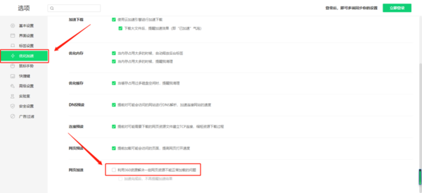 在设置界面的左侧找到“优化加速”模块,并在优化加速模块右侧的显示界面中拉到最下方,然后将“利用360资源解决一些网页资源不能正常加载的问题”一选项勾选上,这时浏览器就会对网页自动进行加速了。