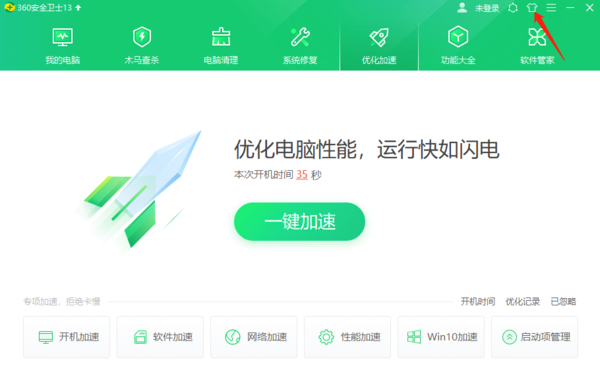 关于360安全卫士更换皮肤,其实非常简单;只需我们打开360安全卫士,点击主界面右上角的【T恤衫】图标,之后会弹出皮肤设定界面。