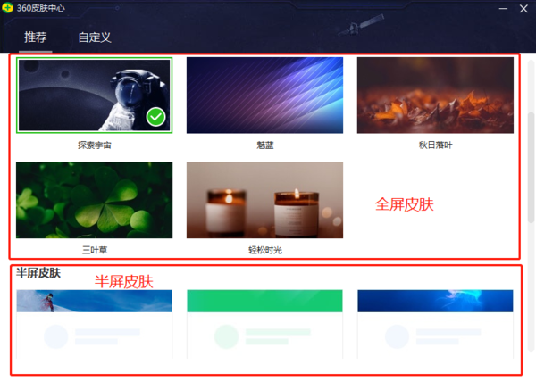 A1:360安全卫士的皮肤,主要是“全屏皮肤”和“半屏皮肤”,看大家喜欢哪种类型的,就去换哪个即可。