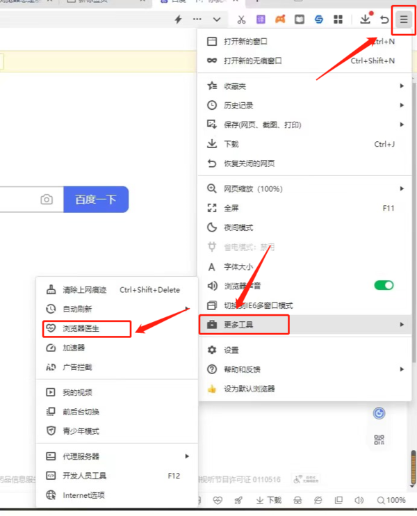 3、可以尝试使用360浏览器中自带的“浏览器医生”来修复一下浏览器,仍然是在右上角的“菜单”中,找到“更多工具”,最后点击左侧列表中的“浏览器医生”。
