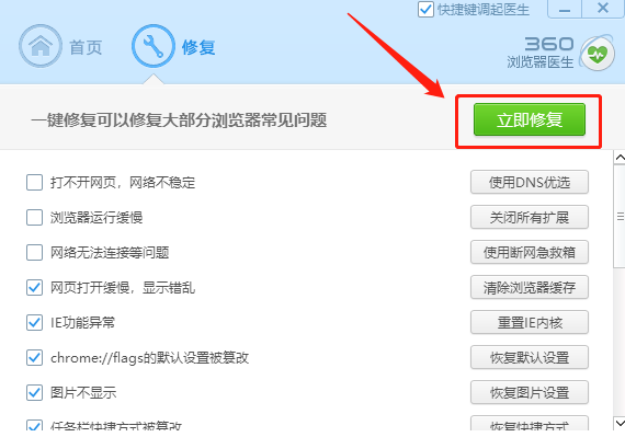打开“浏览器医生”界面后,单击“立即修复”,等待修复完成后重启浏览器试试看。