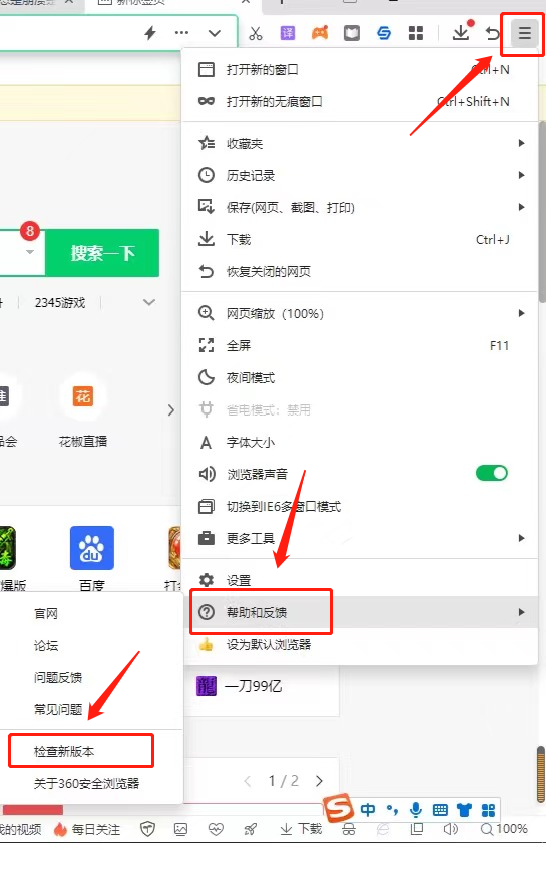 1、首先可以对现有的浏览器版本进行升级,点击浏览器右上方三条横线样式的“菜单”,在最下方找到“帮助与反馈”,点击后在左侧选择“检查新版本”。