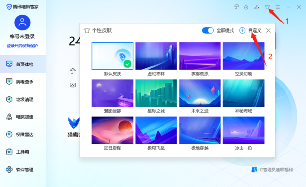 第一步,我们打开电脑管家的主界面,然后点右上角的【T恤衫】图标,进入皮肤界面。