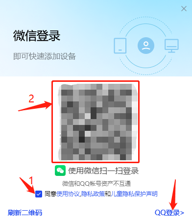 1、勾选同意协议。在未勾选的情况下,二维码是模糊的,此时我们无法扫码登录,因此需要先勾选同意协议,二维码才会变成清晰的,届时我们才可以登录。