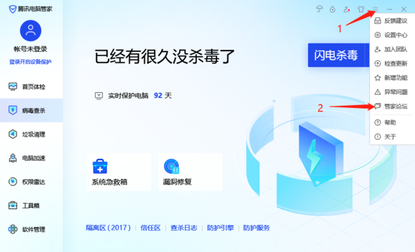 首先,我们打开腾讯电脑管家,来到主界面。在主界面的右上角,我们可以看到【三道杠】按钮,点击它即可召唤扩展菜单;接着我们在扩展菜单中即可看到其中一项为【管家论坛】,点击后,稍等片刻即可跳转到管家论坛网页。