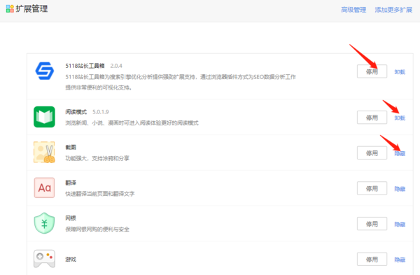在插件管理界面中,我们可以看到自己所安装的种种插件,同时我们可以对它们进行启/停用、卸载、隐藏等操作。如果要停用某个插件的话,我们点击插件右边的【停用】即可;此外,要卸载,就点在右边的【卸载】,不过,对于卸载不了的插件,我们不想看到它的话,就点【隐藏】。