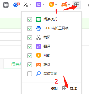 我们点击刚才所说的【田字格】按钮,会伸展出关于插件的各种操作,此时只需我们点击右下角的【管理】即可进入插件管理界面。