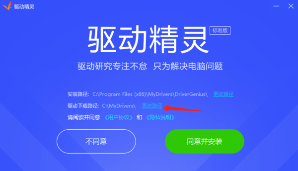 在安装界面,我们不但可以看到驱动精灵本身的安装路径,还可以看到下方有驱动下载路径,点击【更改路径】即可修改驱动下载路径到我们需要放置的地方。