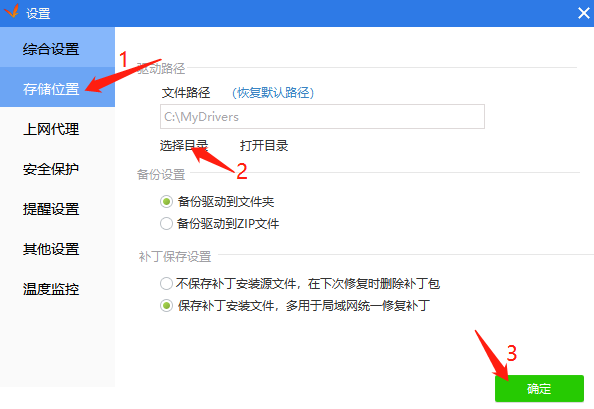 在设置界面中,我们点击左侧模块栏的第二项——【存储位置】,然后就可以看到驱动下载路径设置,接下来点【选择目录】,去更改路径。