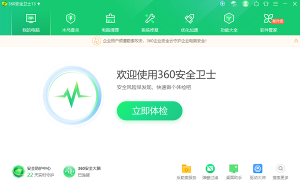 360安全卫士在安全防护方面,除了拥有基础的系统体检以外,还有“安全防护中心”以及“360安全大脑”,这两者可以让我们获得更加有效、更加全面的防护;而且360安全卫士还能让我们进行漏洞修复,从入口处就开始阻拦“有害物质”;另外,360安全卫士的安全辅助功能也是目前安全类软件中较为丰富的,可以全方位地辅助电脑运行。